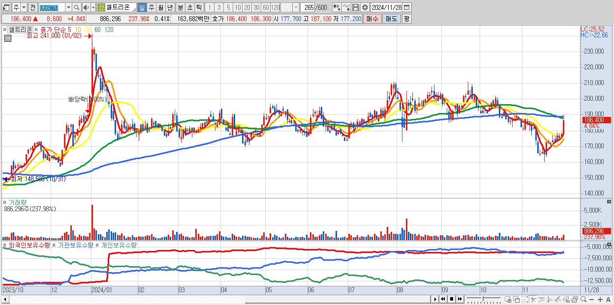 - 셀트리온 (186,400원 ▲ 4.84% , 시총: 404,634억, 거래량: 886,296, 거래대금:1,637억)