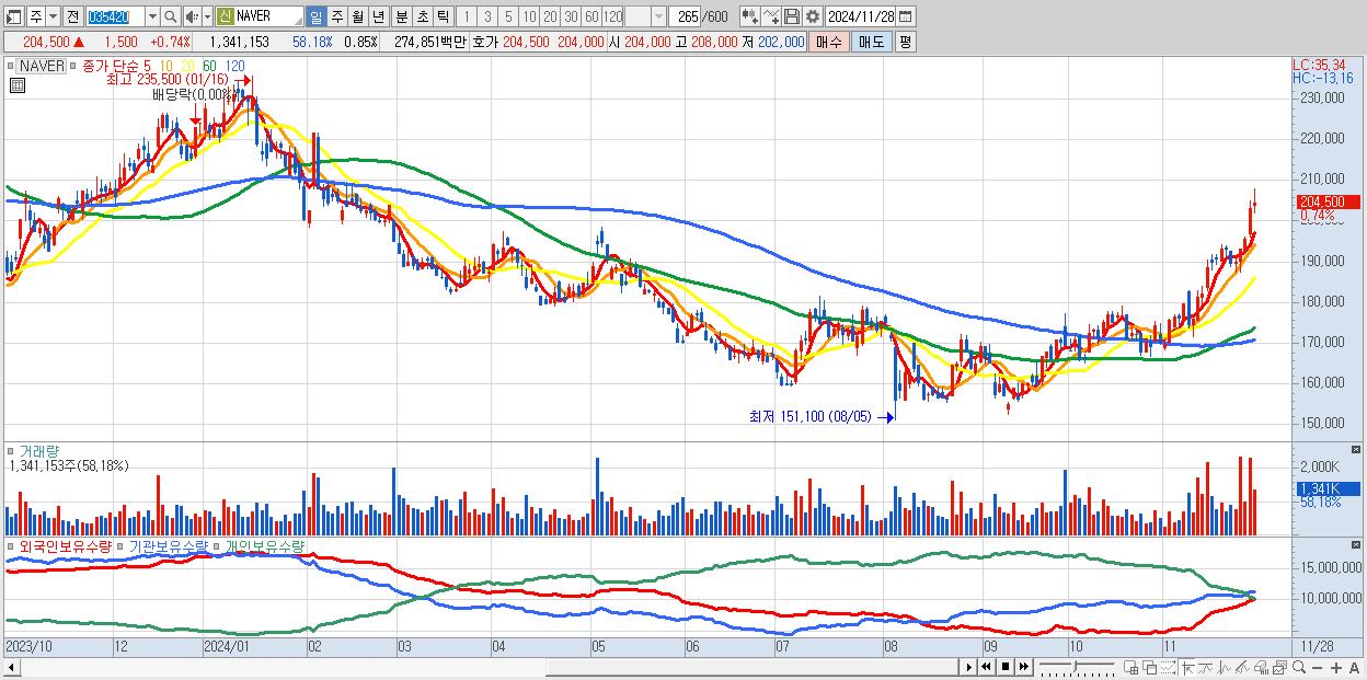 - NAVER (204,500원 ▲ 0.74% , 시총: 324,004억, 거래량: 1,341,153, 거래대금:2,749억)