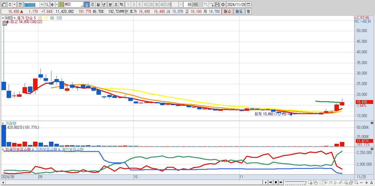 - M83 (16,490원 ▲ 7.64% , 시총: 1,284억, 거래량: 11,420,882, 거래대금:1,927억)