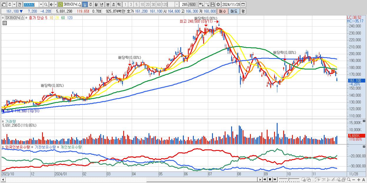 - SK하이닉스 (161,100원 ▼ -4.28% , 시총: 1,172,812억, 거래량: 5,691,298, 거래대금:9,259억)
