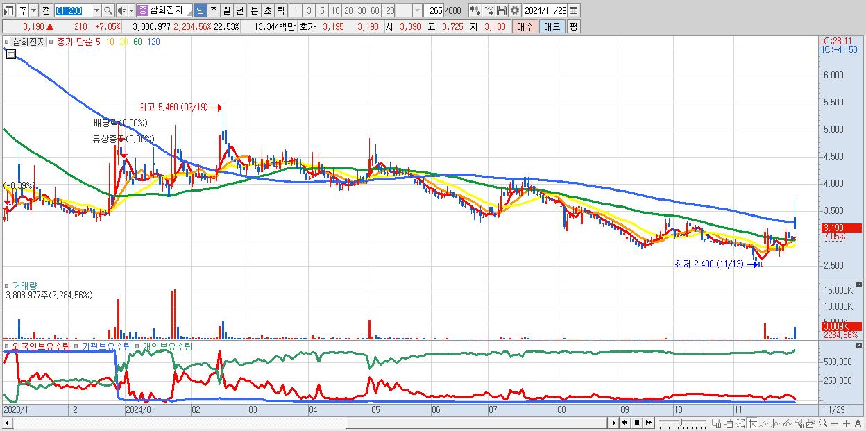 - 삼화전자 (3,190원 ▲ 7.05% , 시총: 539억, 거래량: 3,808,977, 거래대금:133억)