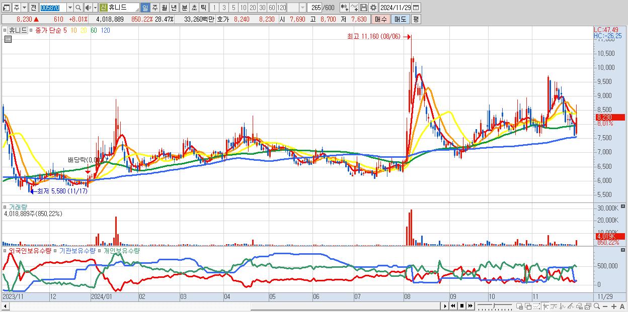 - 휴니드 (8,230원 ▲ 8.01% , 시총: 1,162억, 거래량: 4,018,889, 거래대금:333억)