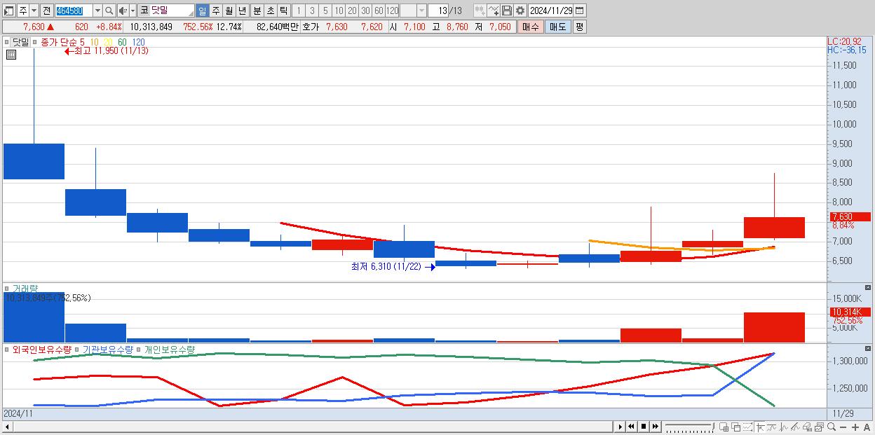 - 닷밀 (7,630원 ▲ 8.84% , 시총: 698억, 거래량: 10,313,849, 거래대금:826억)
