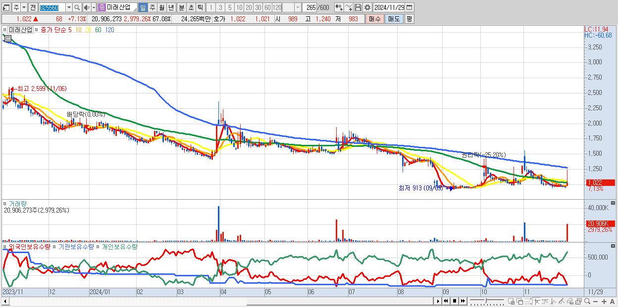 - 미래산업 (1,022원 ▲ 7.13% , 시총: 319억, 거래량: 20,906,273, 거래대금:243억)
