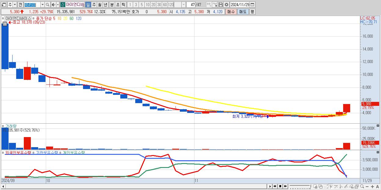 - 아이언디바이스 (5,380원 ▲ 29.79% , 시총: 735억, 거래량: 15,335,981, 거래대금:752억)