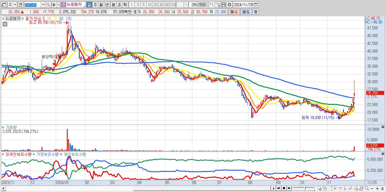 - 뉴로메카 (26,350원 ▲ 7.77% , 시총: 2,780억, 거래량: 2,075,332, 거래대금:570억)