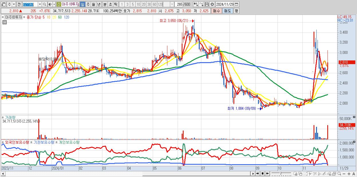 - 아주IB투자 (2,810원 ▲ 7.87% , 시총: 3,399억, 거래량: 34,717,513, 거래대금:1,003억)