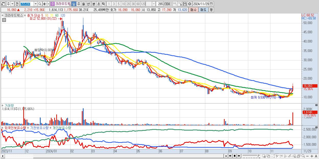 - 크라우드웍스 (16,060원 ▲ 15.96% , 시총: 678억, 거래량: 1,614,113, 거래대금:255억)