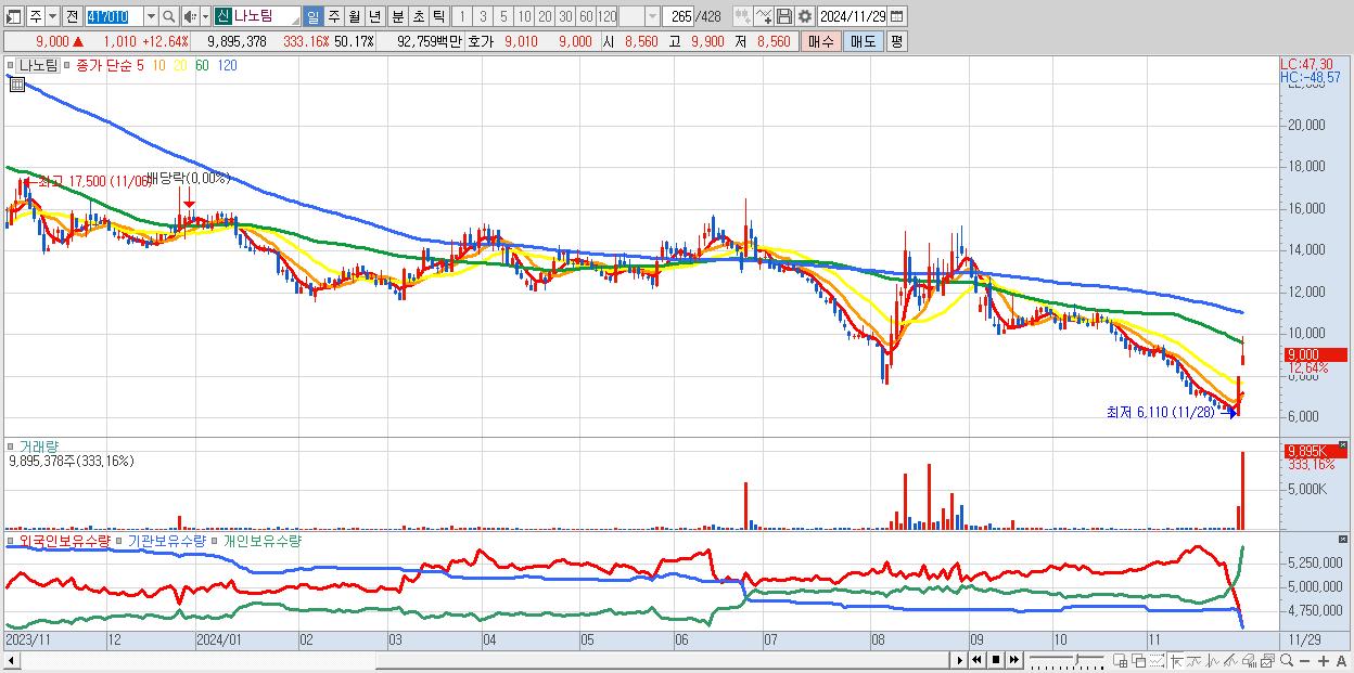 - 나노팀 (9,000원 ▲ 12.64% , 시총: 1,775억, 거래량: 9,895,378, 거래대금:928억)