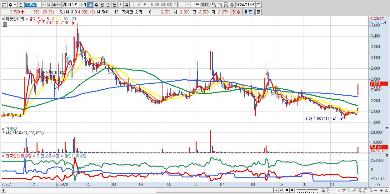- 깨끗한나라 (2,520원 ▲ 29.83% , 시총: 938억, 거래량: 5,414,310, 거래대금:132억)