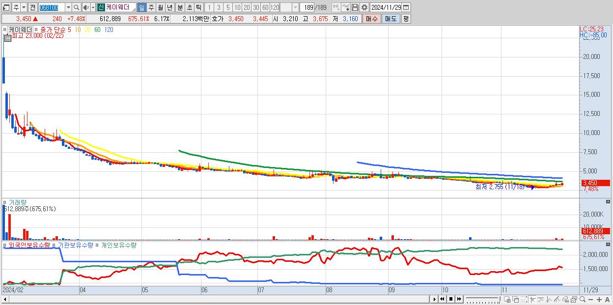 - 케이웨더 (3,450원 ▲ 7.48% , 시총: 343억, 거래량: 612,889, 거래대금:21억)