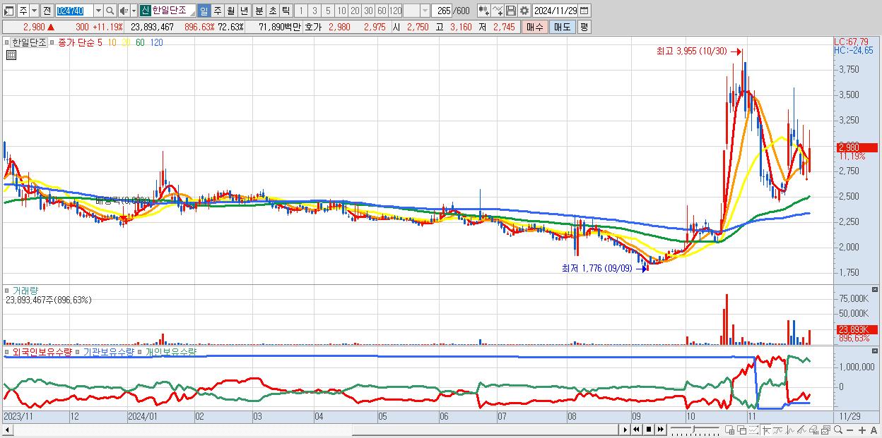 - 한일단조 (2,980원 ▲ 11.19% , 시총: 980억, 거래량: 23,893,467, 거래대금:719억)