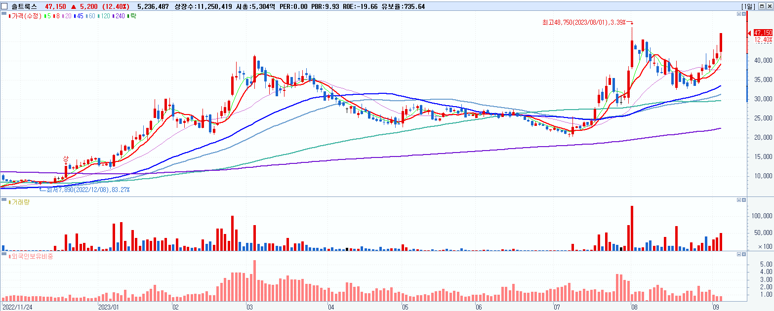 - 솔트룩스 (47,150원 ▲ 12.4% , 시총: 5,305억, 거래량: 5,266,319, 거래대금:2,331억)