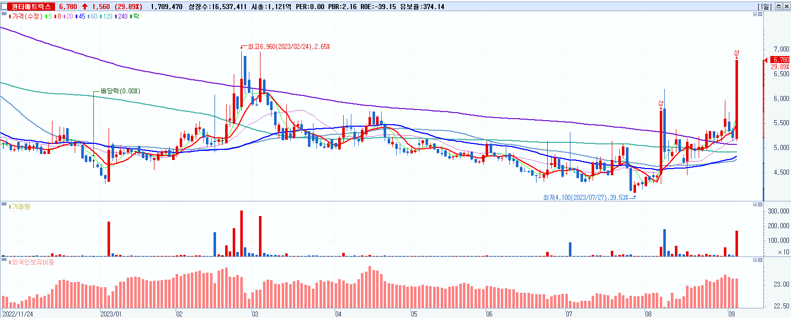 - 퀀타매트릭스 (6,780원 ▲ 29.89% , 시총: 1,121억, 거래량: 1,714,449, 거래대금:111억)