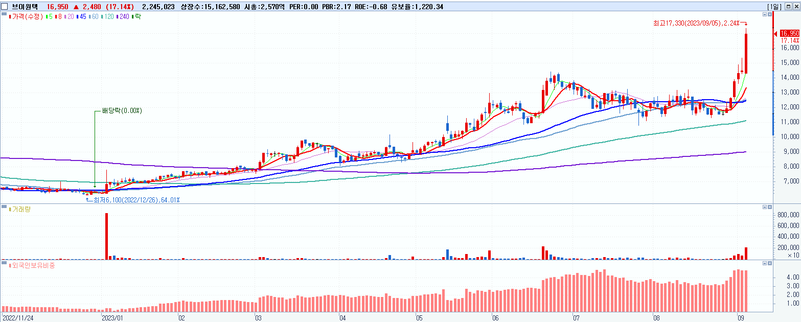 - 브이원텍 (16,950원 ▲ 17.14% , 시총: 2,570억, 거래량: 2,246,035, 거래대금:368억)