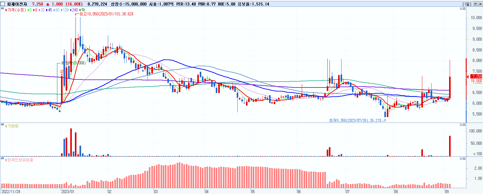 - 피제이전자 (7,250원 ▲ 16% , 시총: 1,088억, 거래량: 8,288,983, 거래대금:619억)
