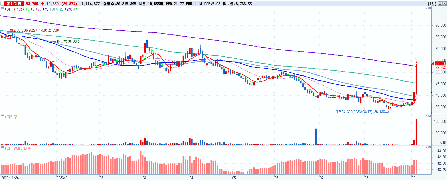 - 동화기업 (53,700원 ▲ 29.87% , 시총: 10,856억, 거래량: 1,116,769, 거래대금:574억)