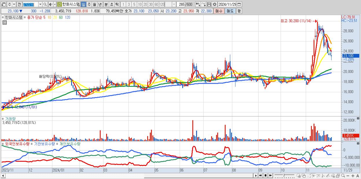 - 한화시스템 (23,100원 ▼ -1.28% , 시총: 43,640억, 외국인 순매수 거래금:41억)