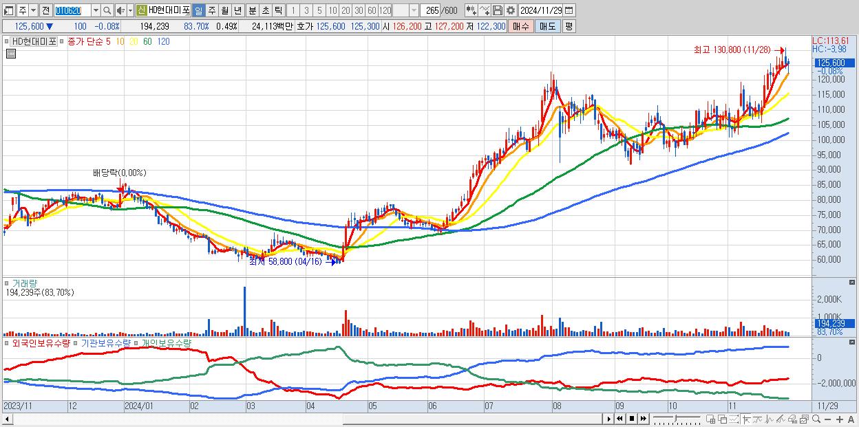 - HD현대미포 (125,600원 ▼ -0.08% , 시총: 50,167억, 외국인 순매수 거래금:19억)