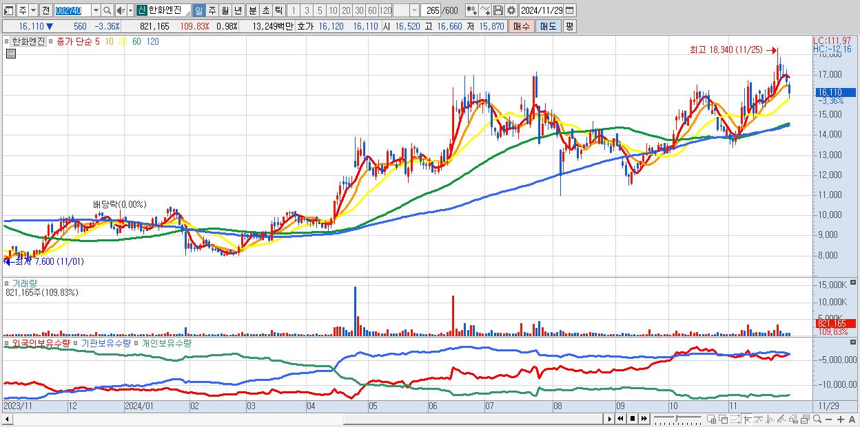 - 한화엔진 (16,110원 ▼ -3.36% , 시총: 13,443억, 외국인 순매수 거래금:17억)