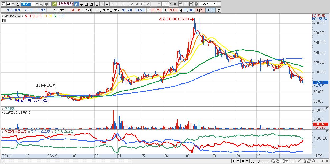 - 삼천당제약 (99,500원 ▼ -3.96% , 시총: 23,340억, 외국인 순매수 거래금:84억)