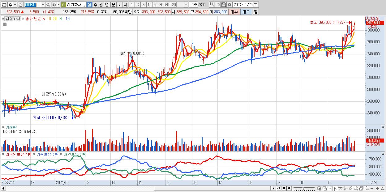 - 삼성화재 (392,500원 ▲ 1.42% , 시총: 185,946억, 외국인 순매수 거래금:43억)