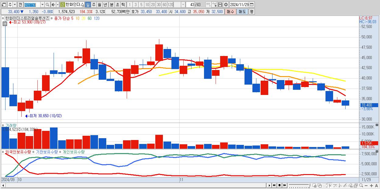- 한화인더스트리얼솔루션즈 (33,400원 ▼ -3.88% , 시총: 16,863억, 외국인 순매수 거래금:51억)