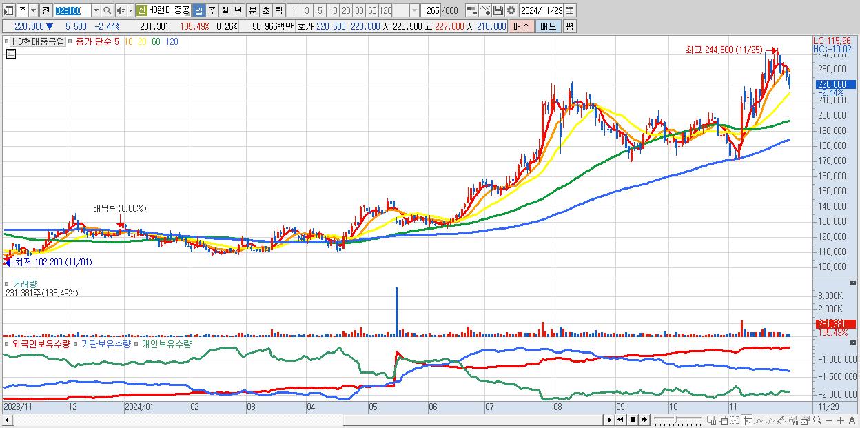 - HD현대중공업 (220,000원 ▼ -2.44% , 시총: 195,301억, 외국인 순매수 거래금:47억)