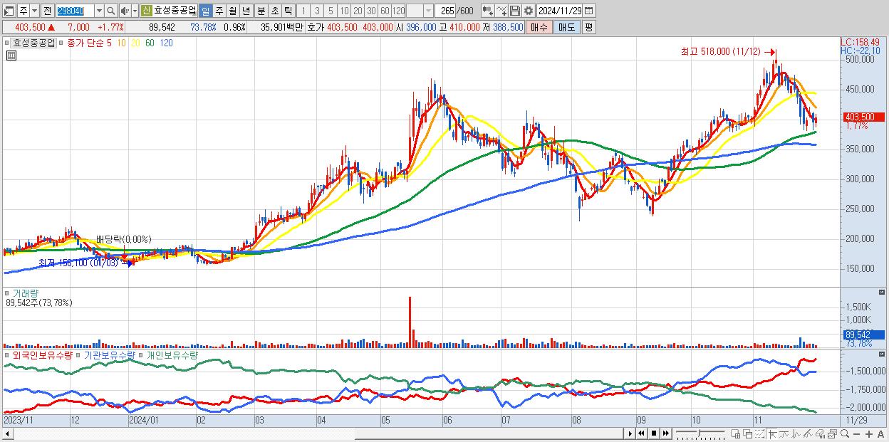 - 효성중공업 (403,500원 ▲ 1.77% , 시총: 37,625억, 외국인 순매수 거래금:74억)