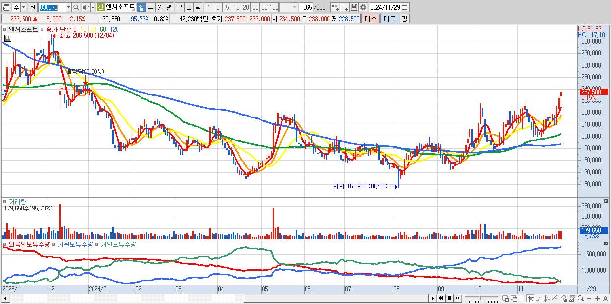 - 엔씨소프트 (237,500원 ▲ 2.15% , 시총: 52,141억, 외국인 순매수 거래금:41억)