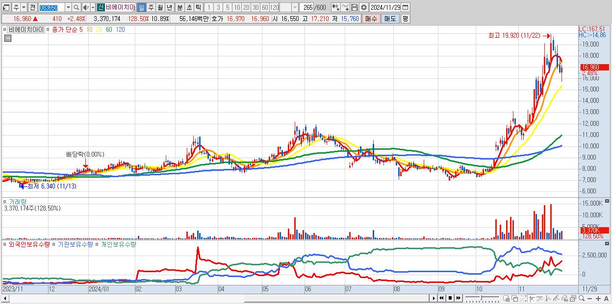 - 비에이치아이 (16,960원 ▲ 2.48% , 시총: 5,248억, 외국인 순매수 거래금:29억)