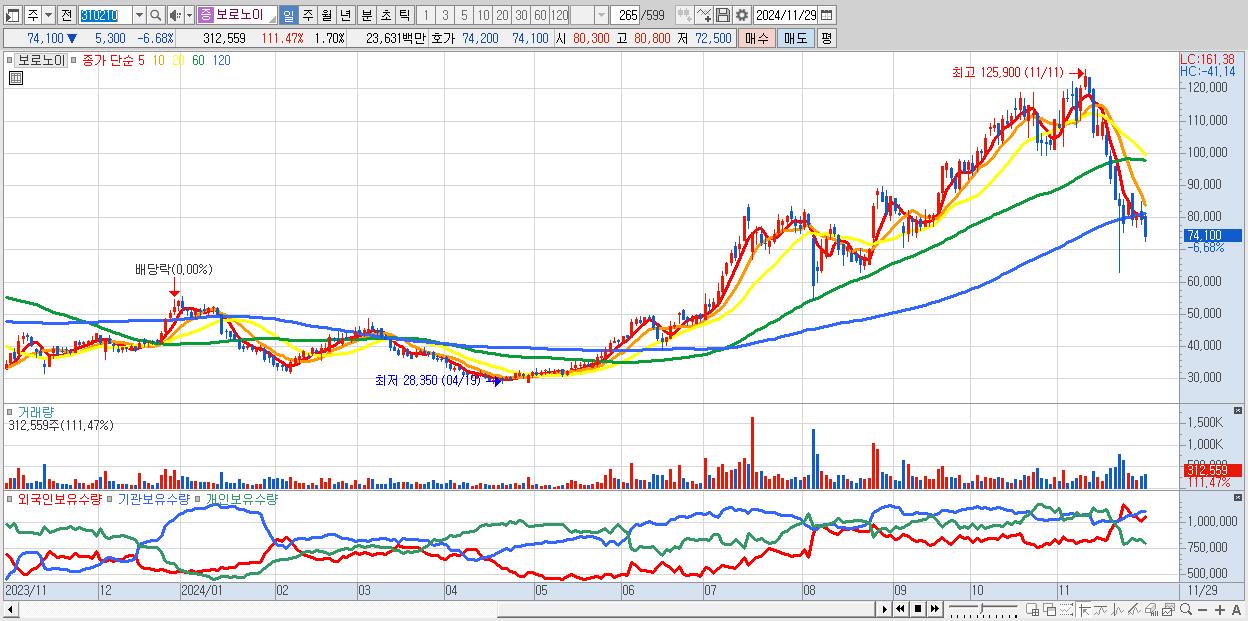 - 보로노이 (74,100원 ▼ -6.68% , 시총: 13,602억, 외국인 순매수 거래금:27억)