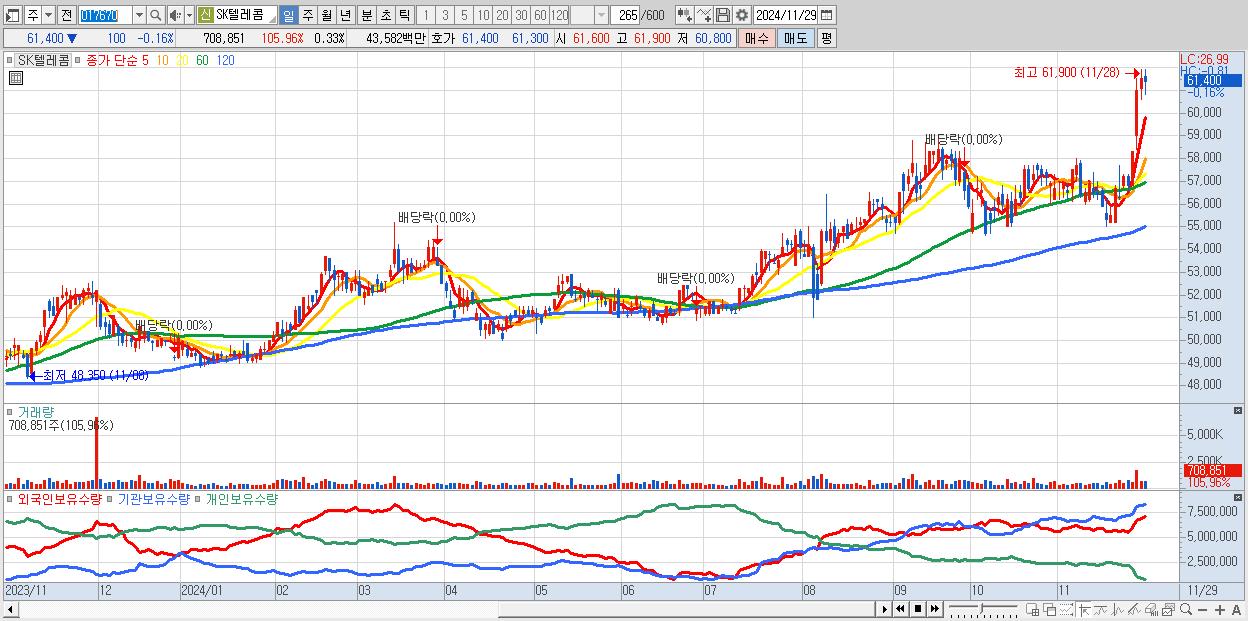 - SK텔레콤 (61,400원 ▼ -0.16% , 시총: 131,881억, 외국인 순매수 거래금:54억)