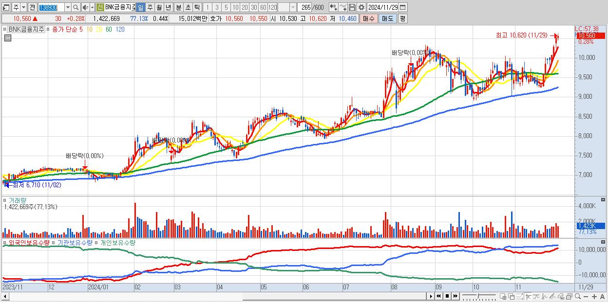 - BNK금융지주 (10,560원 ▲ 0.28% , 시총: 33,838억, 외국인 순매수 거래금:44억)