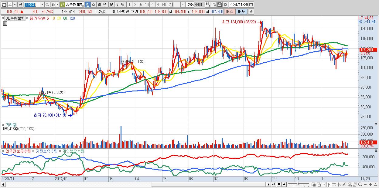 - DB손해보험 (109,200원 ▲ 0.74% , 시총: 77,314억, 외국인 순매수 거래금:28억)