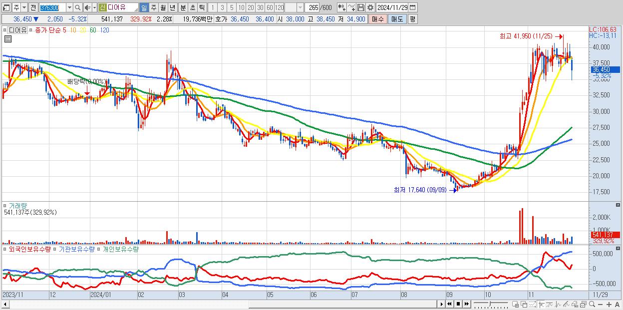 - 디어유 (36,450원 ▼ -5.32% , 시총: 8,653억, 외국인 순매수 거래금:20억)