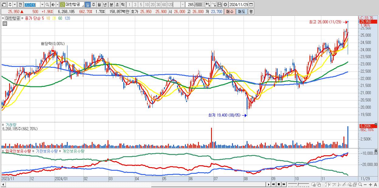 - 대한항공 (25,950원 ▲ 1.96% , 시총: 95,553억, 외국인 순매수 거래금:200억)