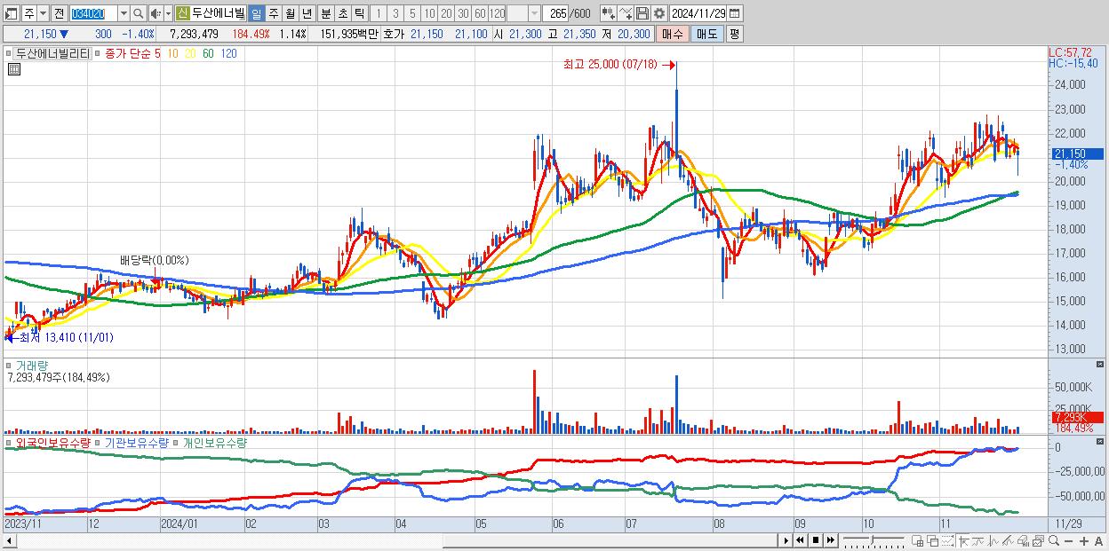 - 두산에너빌리티 (21,150원 ▼ -1.4% , 시총: 135,479억, 외국인 순매수 거래금:35억)