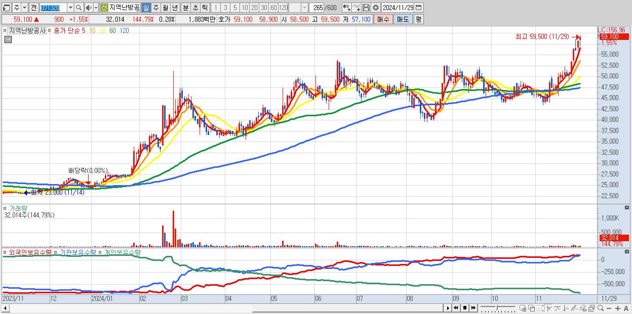 - 지역난방공사 (59,100원 ▲ 1.55% , 시총: 6,843억, 거래량: 32,014, 거래대금:19억, KOSPI)