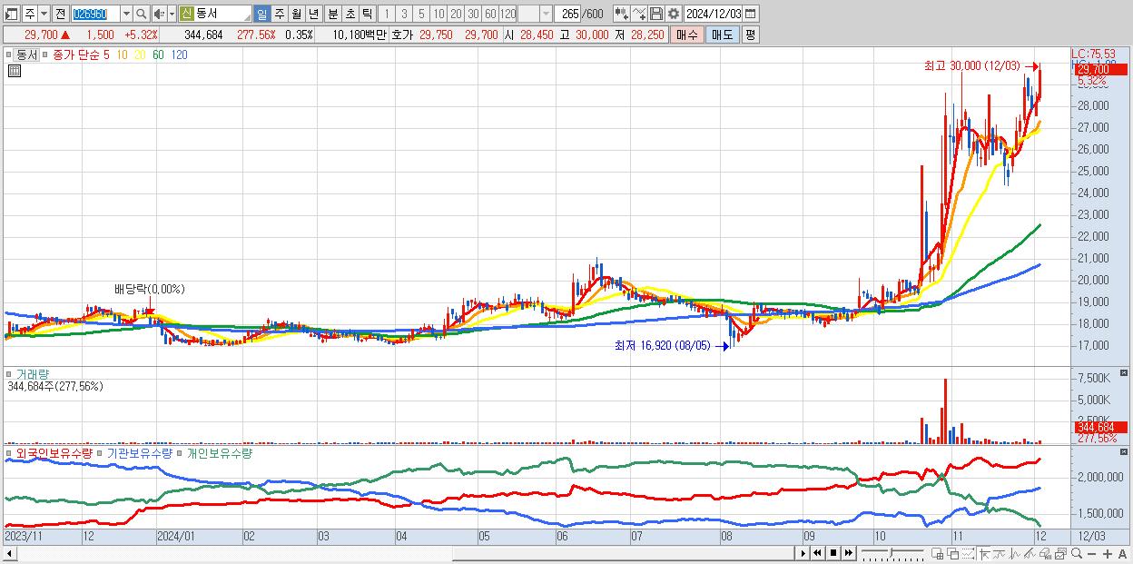 - 동서 (29,700원 ▲ 5.32% , 시총: 29,611억, 거래량: 344,684, 거래대금:102억, KOSPI)