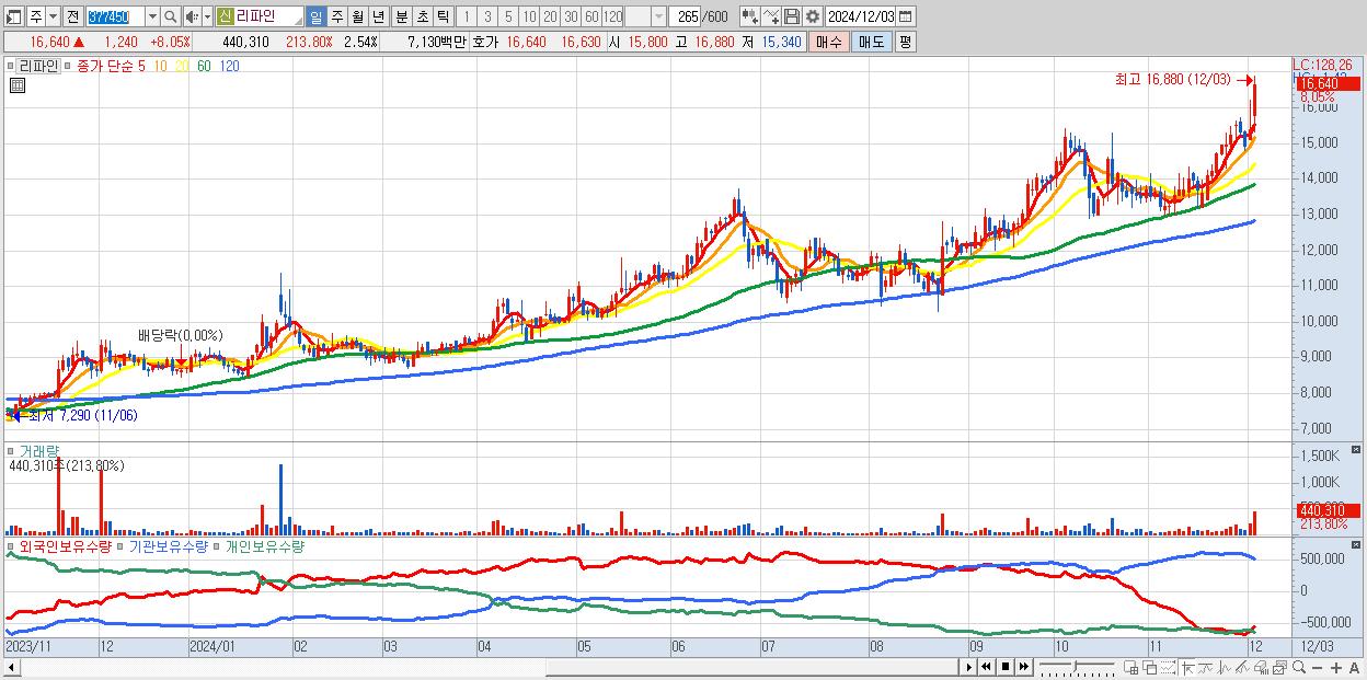 - 리파인 (16,640원 ▲ 8.05% , 시총: 2,884억, 거래량: 440,310, 거래대금:71억, KOSDAQ)