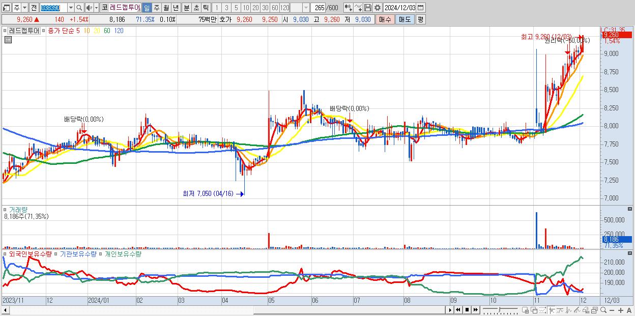 - 레드캡투어 (9,260원 ▲ 1.54% , 시총: 774억, 거래량: 8,186, 거래대금:1억, KOSDAQ)