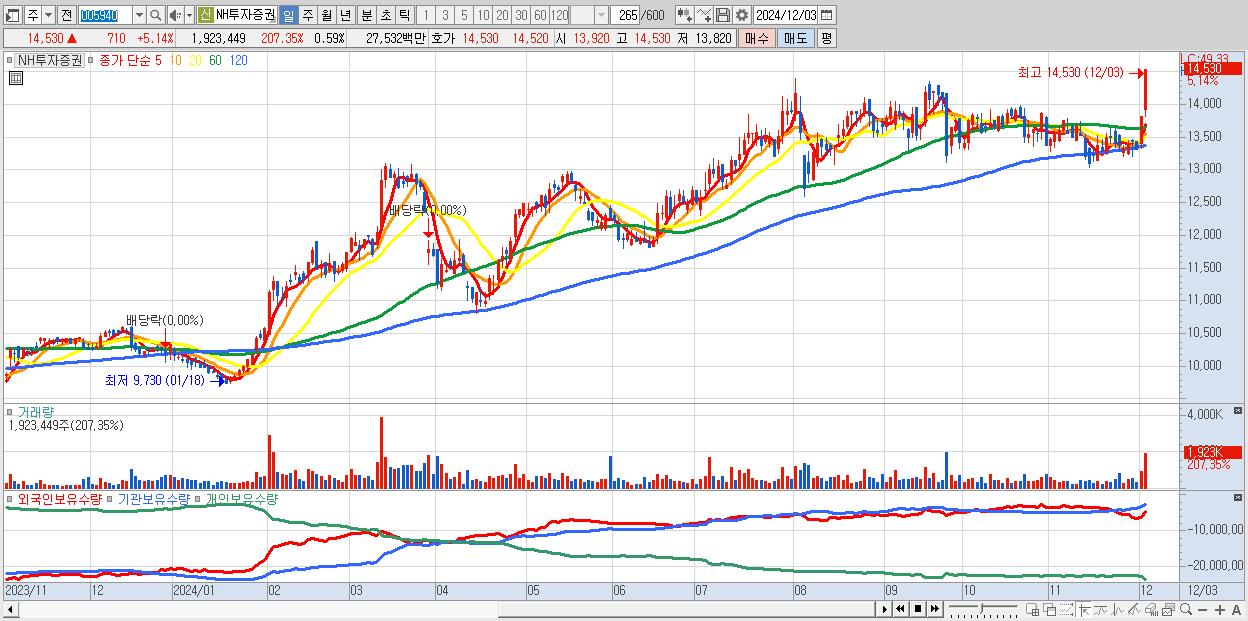 - NH투자증권 (14,530원 ▲ 5.14% , 시총: 47,585억, 거래량: 1,923,449, 거래대금:275억, KOSPI)