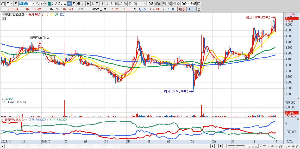 - 에이플러스에셋 (4,810원 ▲ 3.44% , 시총: 1,087억, 거래량: 87,336, 거래대금:4억, KOSPI)