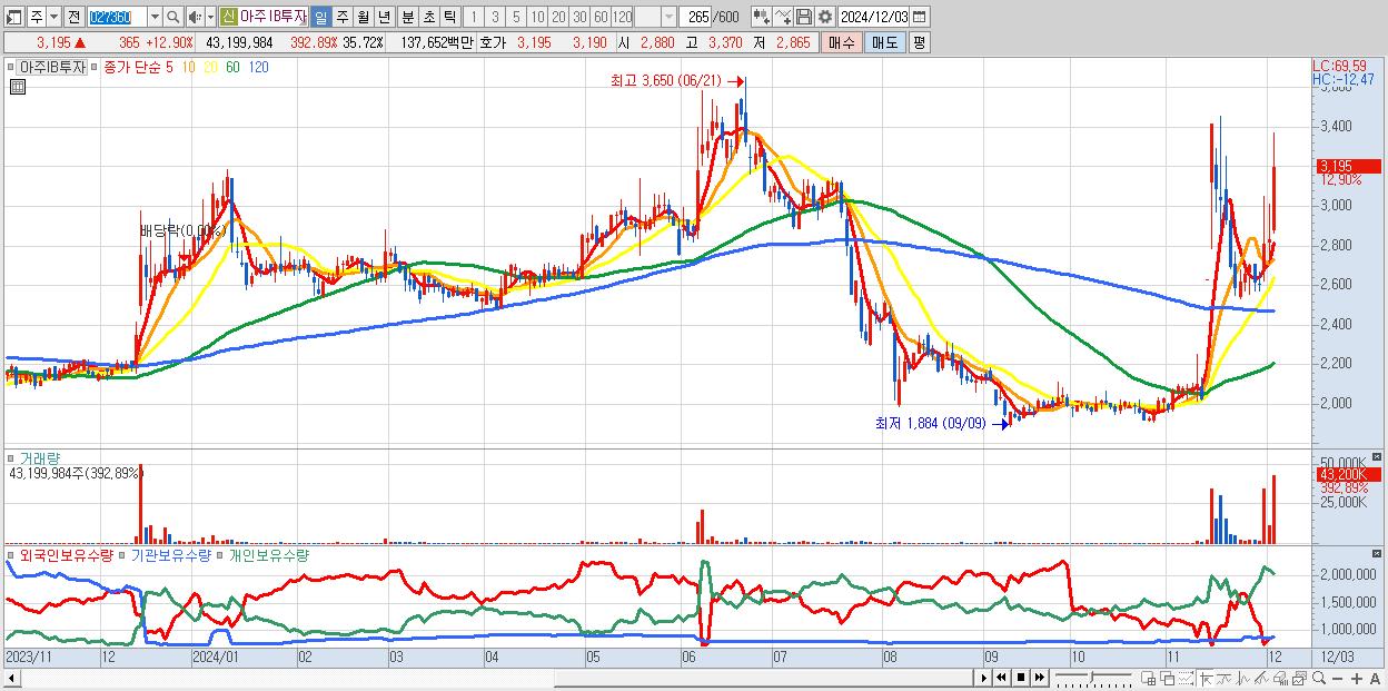 - 아주IB투자 (3,195원 ▲ 12.9% , 시총: 3,864억, 거래량: 43,199,984, 거래대금:1,377억)