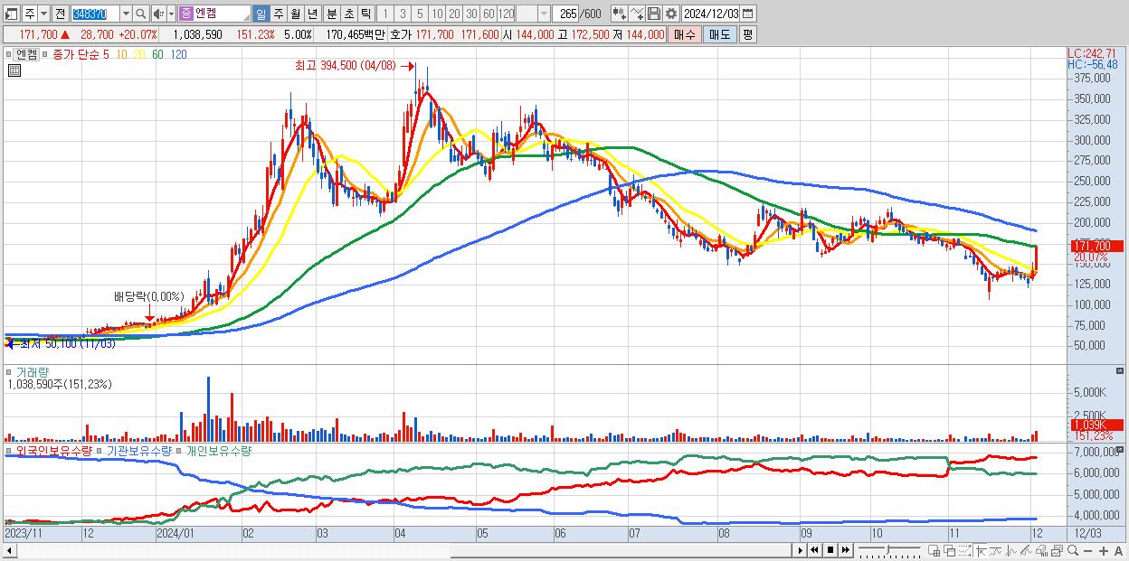 - 엔켐 (171,700원 ▲ 20.07% , 시총: 35,691억, 거래량: 1,038,590, 거래대금:1,705억)