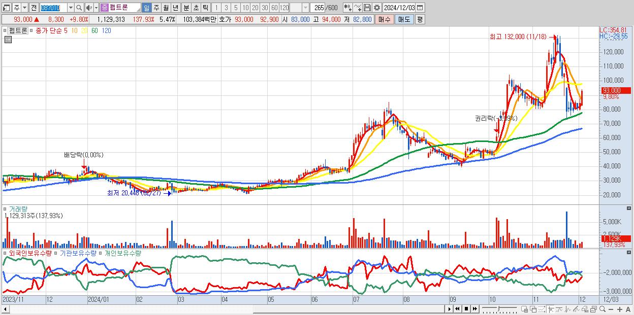 - 알테오젠 (325,000원 ▲ 7.62% , 시총: 173,286억, 거래량: 1,147,622, 거래대금:3,695억)