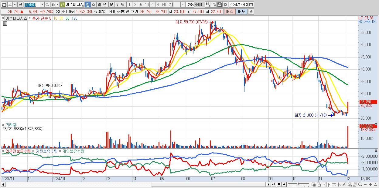 - 이수페타시스 (26,750원 ▲ 26.78% , 시총: 16,918억, 거래량: 23,921,958, 거래대금:6,005억)