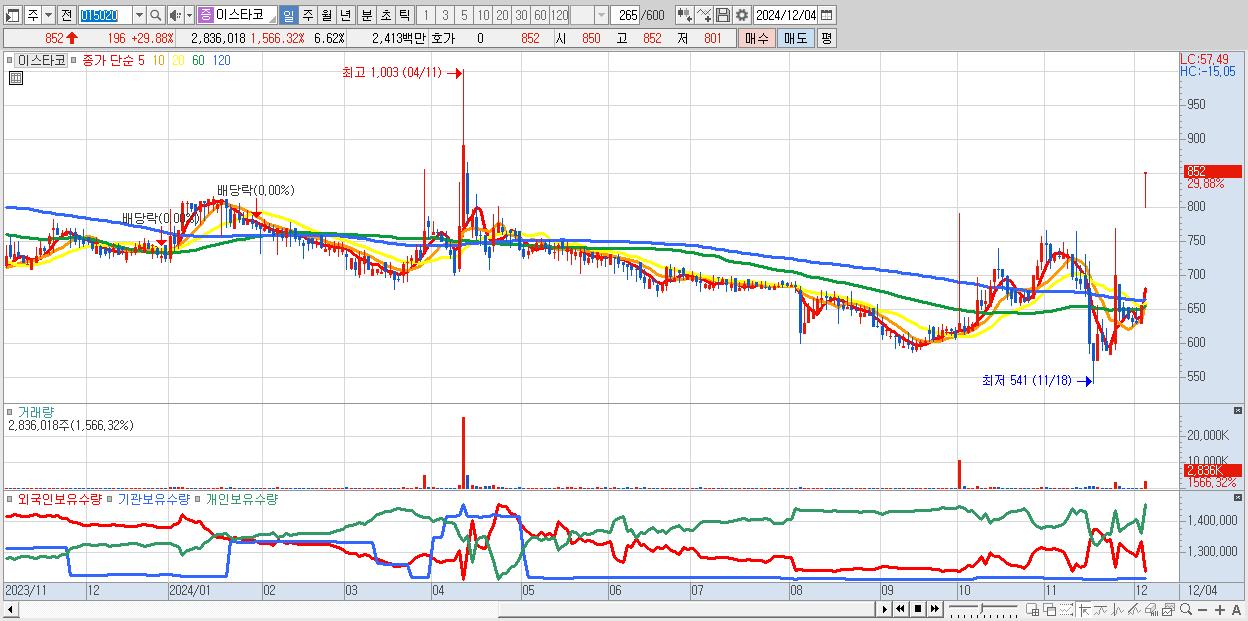 - 이스타코 (852원 ▲ 29.88% , 시총: 365억, 거래량: 2,836,018, 거래대금:24억)