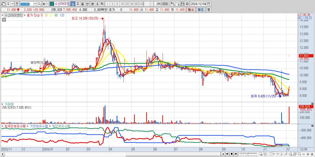 - 수산아이앤티 (11,400원 ▲ 29.99% , 시총: 770억, 거래량: 295,529, 거래대금:34억)